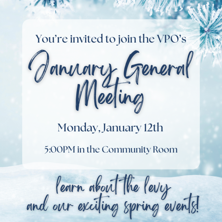 Join us for the second VPO meeting of the year! We'll be talking about upcoming events, open committee spots, and hearing from our principal, Mr. Brooks.